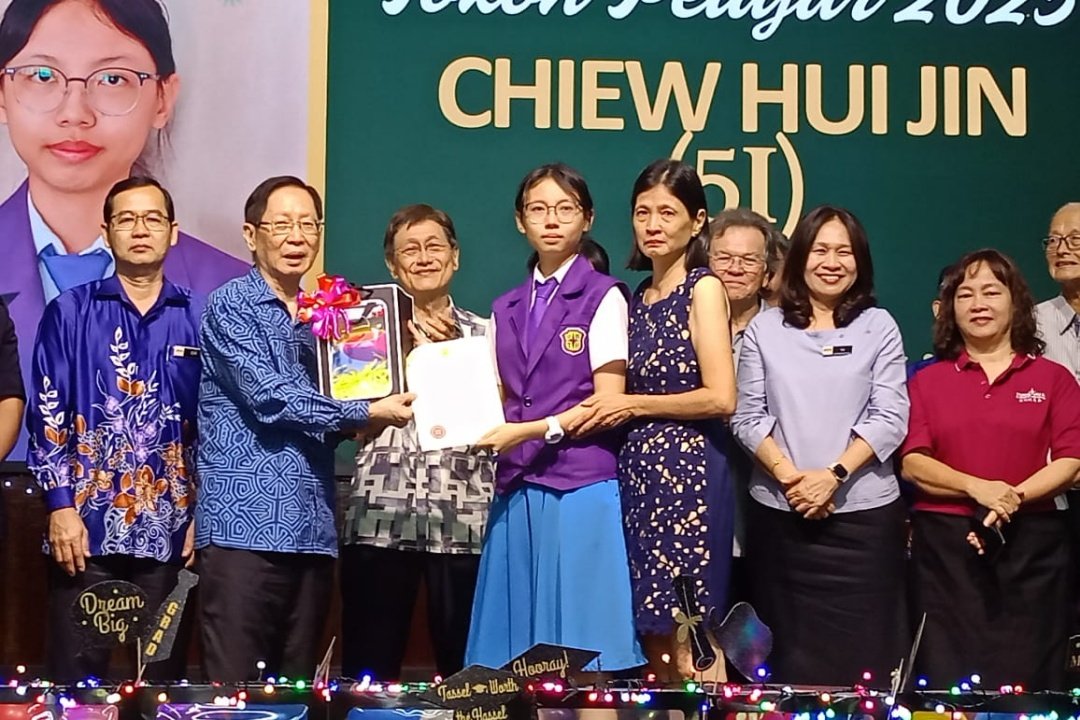 Lau (second left) presents the Model Student Award to Chiew Hui Jin, as Goi (left),…