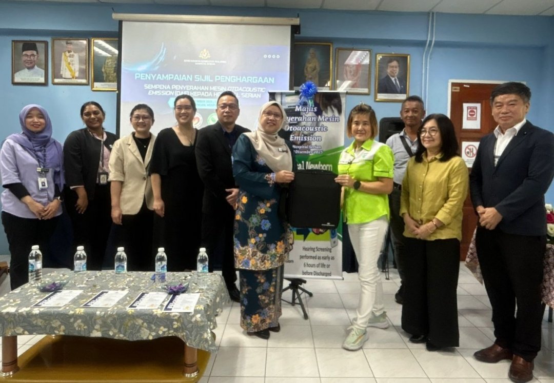 Yee (fourth right) hands over the OAE machine to Serian Hospital director Dr Maria Mesran,…