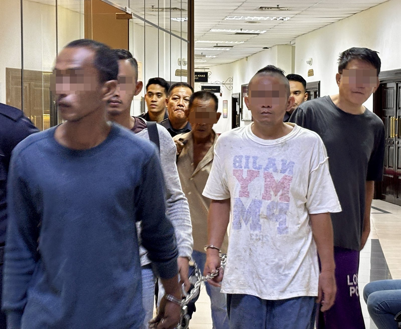 The accused (second right) is escorted to proceedings at the Kuching Court Complex. — Photo by Kentigern Minggu