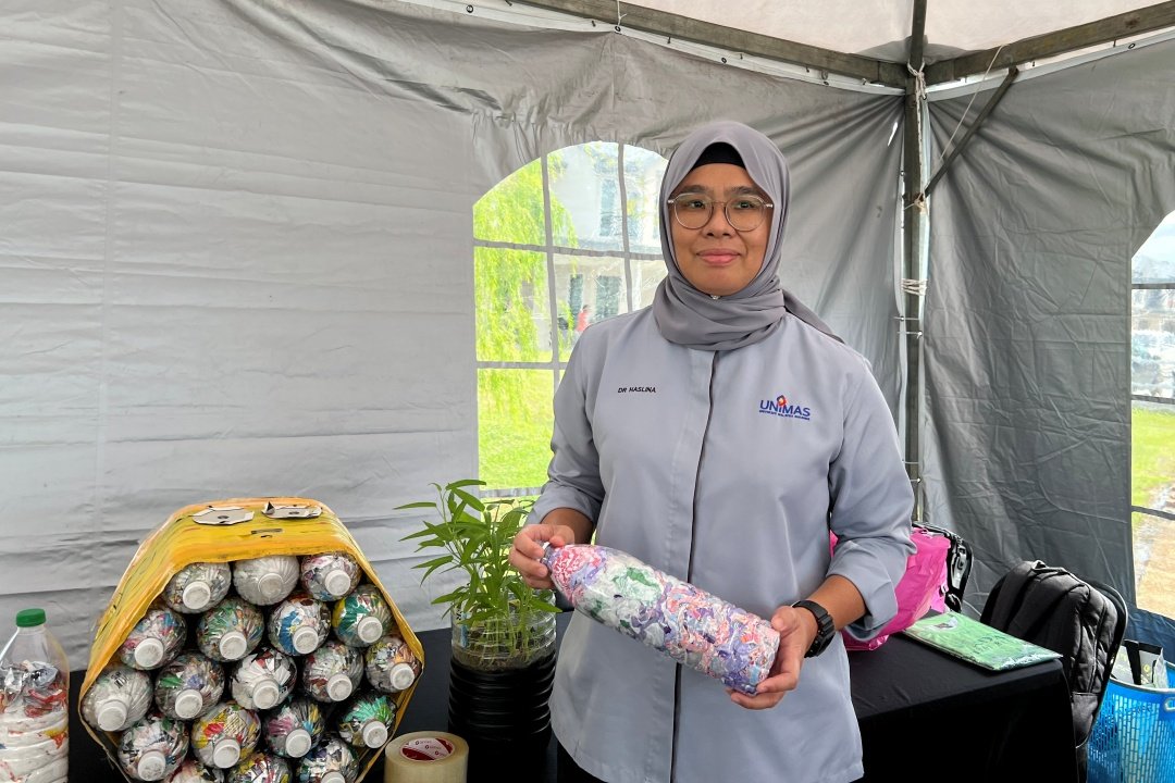 Dr. Haslina Hashim holds an example of an ecobrick during the sustainability exhibition at the programme.